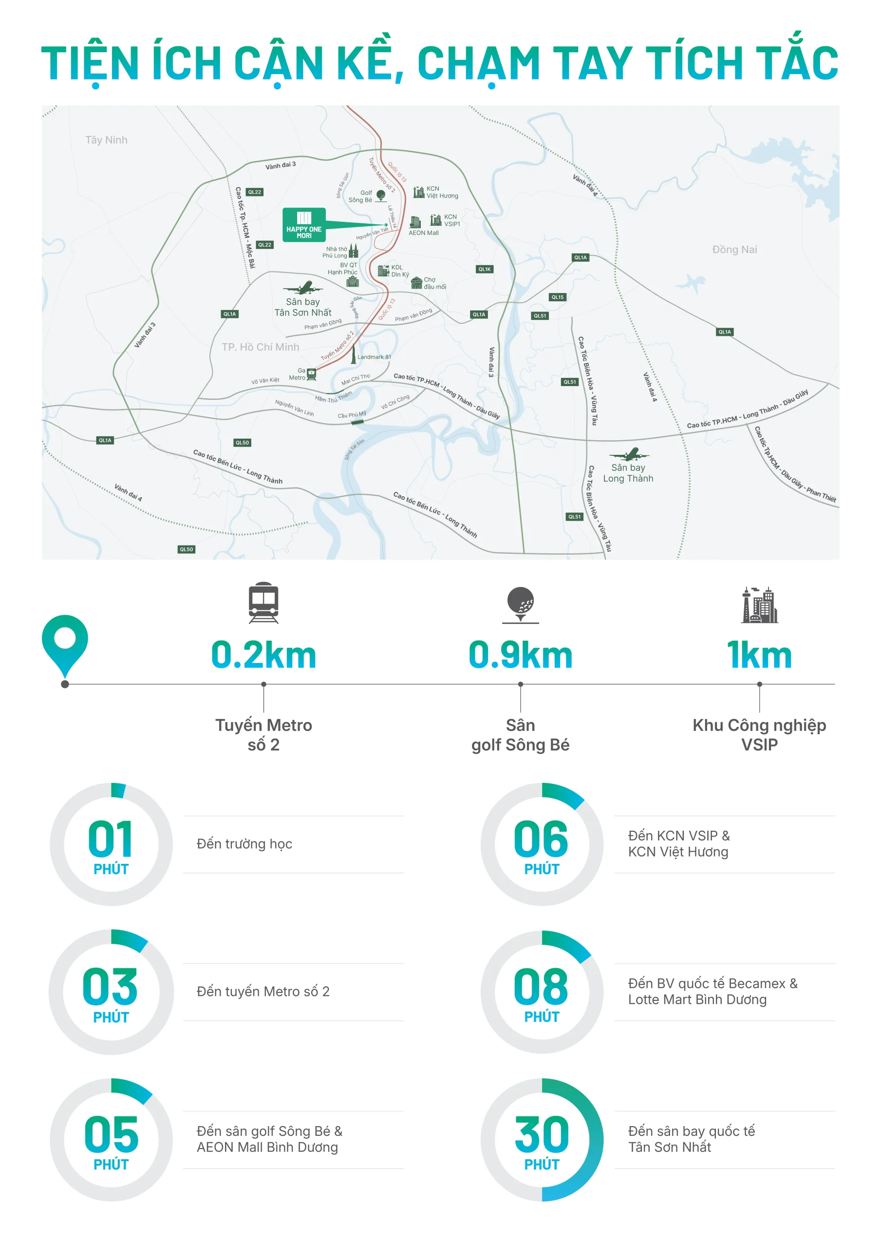 Ngoài ra, cư dân Happy One Mori sẽ được tận hưởng hệ thống tiện ích ngoại khu đa dạng trong bán kính gần, bao gồm:
