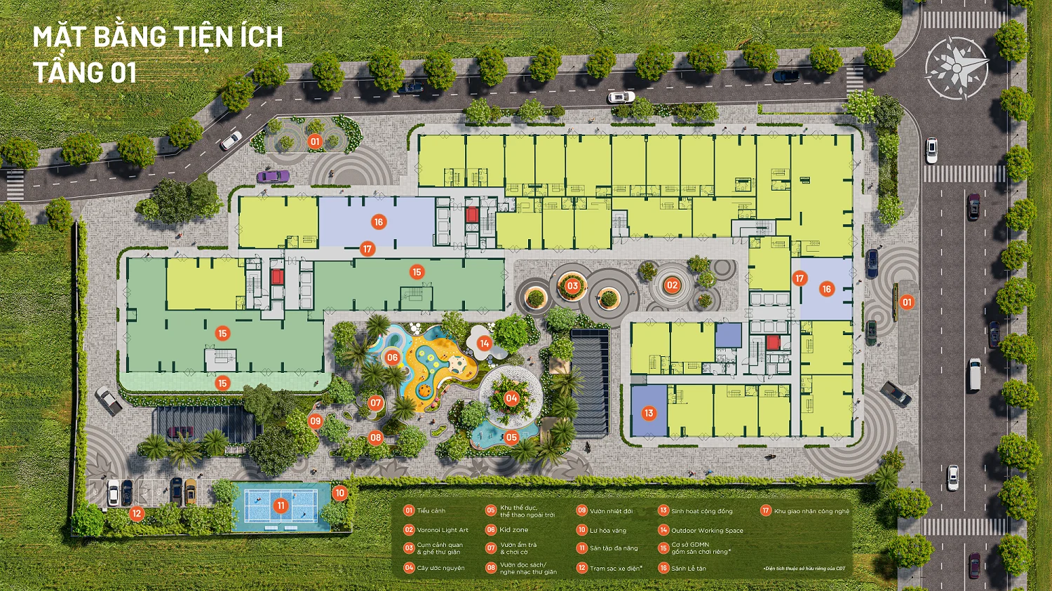 - Không gian xanh và thư giãn: Công viên trung tâm, đường chạy bộ tổng hợp, quảng trường chân mây (trên cao) với khu BBQ, yoga, thiền, khu đi bộ và vườn cây xanh. Đây là những tiện ích cốt lõi tạo nên không gian sống trong lành, mát mẻ, mang đến hơi thở trong lành cho cư dân.